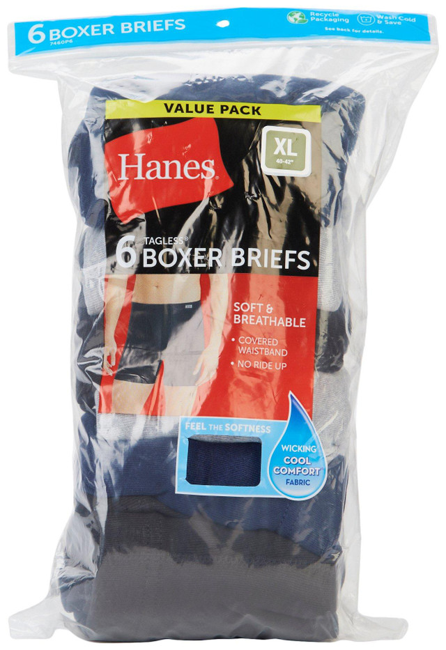 These boxer briefs feature solid color designs on a soft knit fabrication, a covered elastic waistband, Cool Comfort wicking technology, tagless comfort, and no-ride-up design. Contains 6 boxer briefs. Fabrication cotton, polyester.