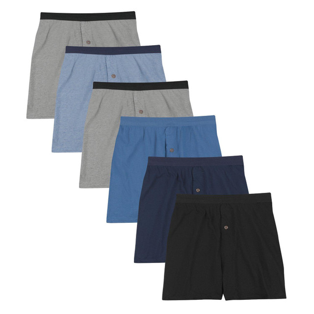 These boxers feature a solid color design on a soft knit fabrication, a Comfort Flex elastic waistband that adjusts to fit, a single-button no-gap fly, Cool Comfort wicking technology, and tagless comfort. Contains six boxers. Fabrication is 55% cotton and 45% polyester.