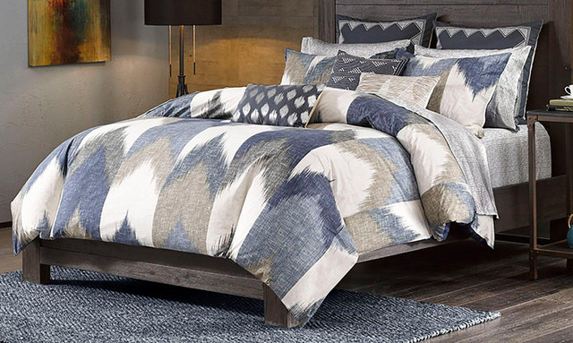 Spice up your bedroom with the INK+IVY Alpine Collection. Rich shades of navy and taupe play up this broken chevron motif for a casual update to your bedroom. Duvet cover features a button closure. Set includes duvet cover and two pillow shams.