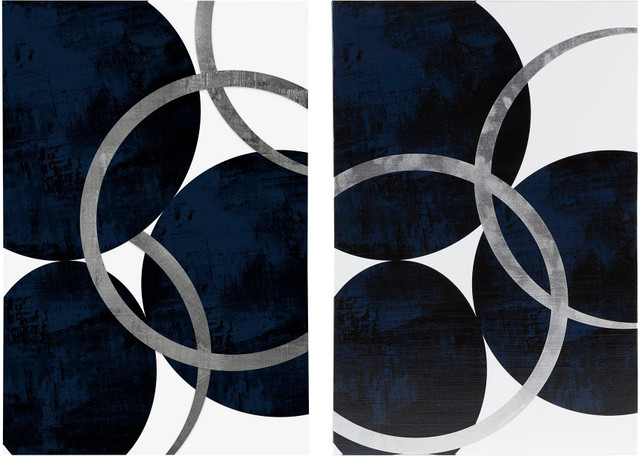 Celestial Orbit Navy is a two-piece gel coated canvas set. The set depicts overlapping circular designs and features a cool color palette of navy blue, metallic silver, and white. Celestial Orbit Navy is a unique addition to any living space. Each piece measures 24''W x 36''H x 1.5''D.