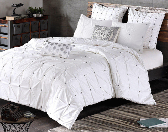 The Ink & Ivy Masie 3-pc. Comforter set features a duvet-inspired tufted look in bright white. Mini set includes a comforter and two pillow shams. Decorative pillows sold separately.