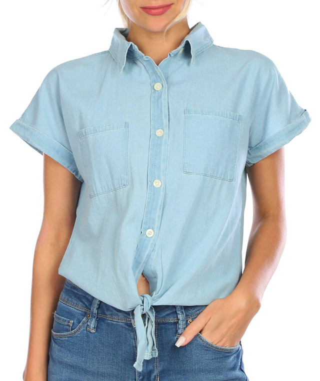 This top features a solid color design on lightweight woven fabric, collared neckline with button down front closure, roll cuff sleeves, front tie, and a casual styling. Top length measures approximately 26 inches from shoulder to hemline. Fabrication is 100% cotton.