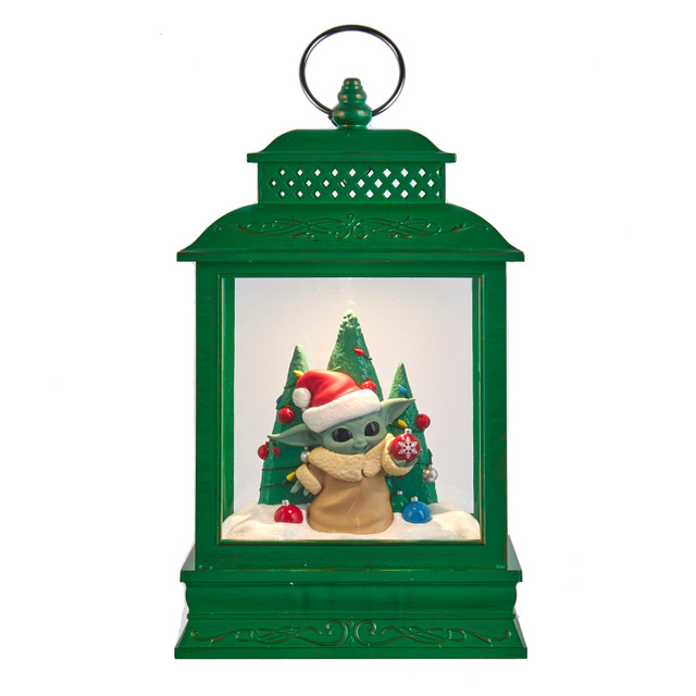 This 10-Inch Battery-Operated The Child Light-Up Lantern Table Piece from Kurt Adler is a festive addition to any home or office holiday décor. It features The Child holding a red and white snowflake ornament in front of three decorated Christmas trees. When switched on, it is illuminated from within. This item requires 3 AA batteries (not included). Measures 6.25 in. x 3.25 in. x 10 in.