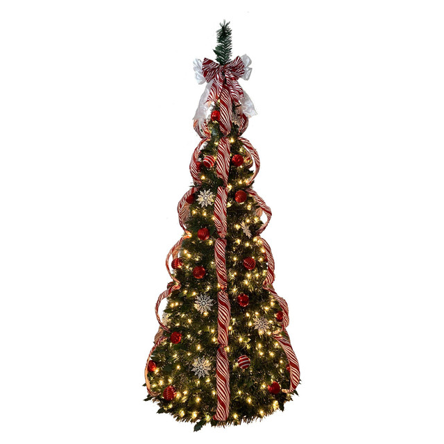 This 6-Foot Pre-Lit Red and White Collapsible Decorated Tree from Kurt Adler is all about convenience. Without requiring any assembly this tree easily pops-up into a fully decorated 6 foot Christmas tree, complete with 300 incandescent lights, ribbon and ornaments. At the end of the season this Christmas tree simply collapses for easy storage. Measures 30 in x 30 in x 72 in.