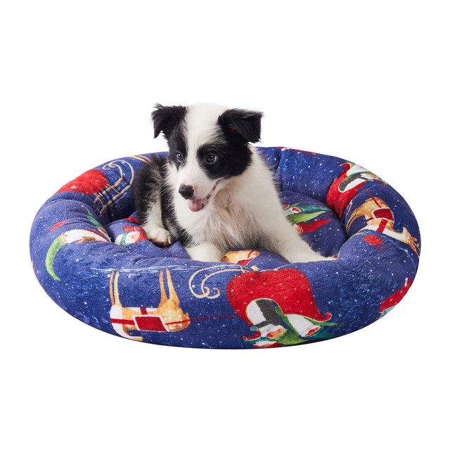 The Gnome For The Holidays pet bed/ dog bed is great for pet lovers. This pet bed features gnomes dressed for Christmas, riding sleighs and bringing gifts. One of our most popular pet beds, Gnome For The Holidays is inspired by whimsical Christmas stories told in front of the fire. This will become your pet's haven whether in the bedroom, family room, living room or den. Made from 100% Polyester Velour, the pet bed is easy to care for. Measures 23in L x 14in W