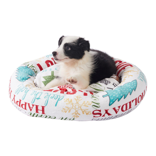 The Christmas Santa Claus Lane pet bed complements the Santa Claus Lane bedding collection but really stands alone as a haven for your pet during the holiday season. This pet bed features all the sweet sentiment of the holiday season with Santas, snowflakes and trees. This will become your pet's haven whether in the bedroom, family room, living room or den. Made from 100% Polyester Velour, the pet bed is easy to care for. Measures 23in L x 14in W