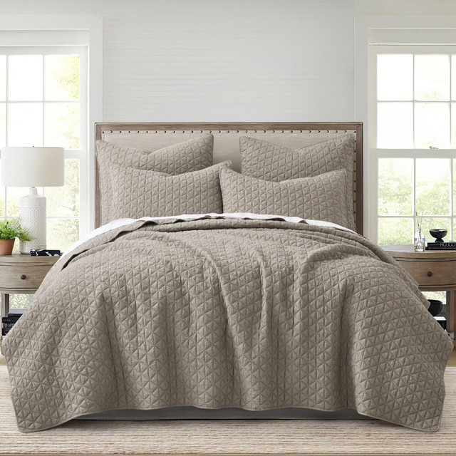 The Rowan Reversible Quilt & Sham Set by Levtex Home is inspired by boho chic fashion. This reversible quilt features beautiful chic crinkle quilted diamond design on the front, reversing to a solid cream on the back. The Quilt & Shams have a microfiber front and back, filled with a cotton-rich filler and are machine washable. Enjoy this for years to come!