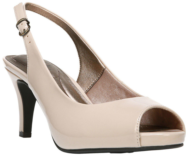 Walk into the room and own it in the Teller pump from LifeStride. Faux leather upper with a peep toe, heel sling strap, and adjustable buckle closure complete this look. Soft System comfort package provides all-day support, flex, and cushioning.