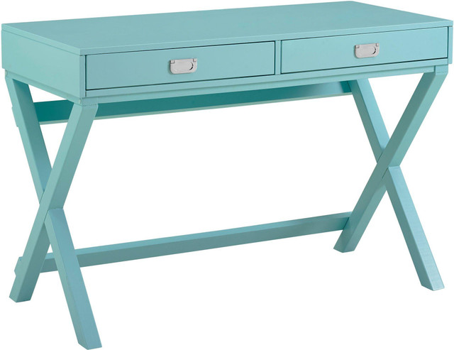 Make work fun with this campaign style Linon Bethany Writing Desk. Finished in pink with rose gold or blue with silver hardware, this desk will add color and life to any space. Along with its fun pop of color the X-framed legs help keep the space sturdy. Two drawers provide ample space for supplies. Measures 44''W x 20''D x 30''H.