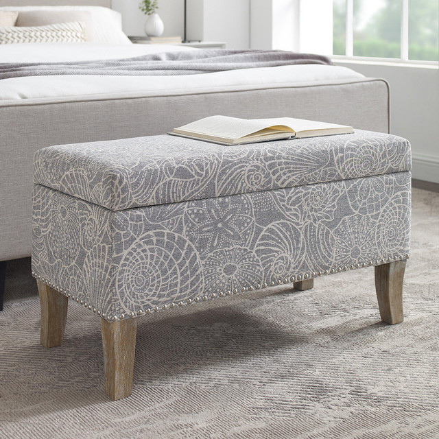 Keep clutter at bay with this versatile storage ottoman featuring durable fabric printed with a large-scale shell pattern in soft hues. The cushioned, upholstered top also provides additional comfortable seating. Place at the foot of a bed, in any entryway, or use as an ottoman for an airy, coastal touch and convenient yet stylish functionality. Measures 32in x 16in x 18in.
