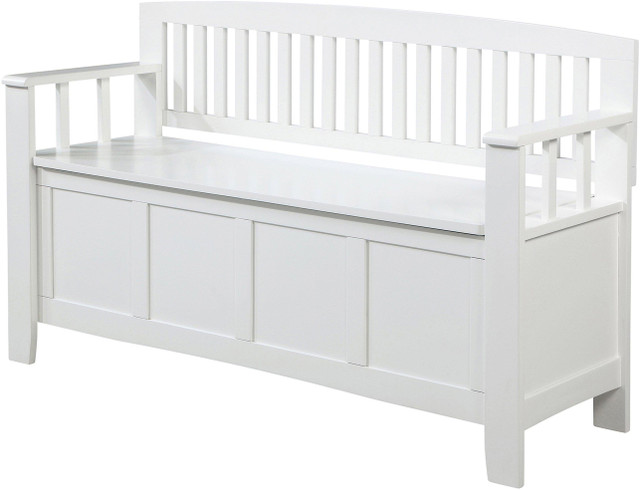 Create added seating and storage to your entry way, mudroom, bedroom or living room with this attractive and sturdy storage bench. The bench features a flip top lid with no-slam hardware, allowing for easy access to items you want out of sight. The slat designed back and armrest are finished in a glossy white paint allowing it to be used with virtually any decor. Add a colorful seat cushion or your favorite accent pillows to brighten up the room. Measures 50w x 17.25d x 32h.