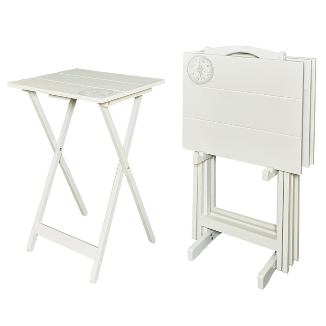 The Malay Compass Tray Table Set has a distinctive look with its sturdy wood construction and planked top. The compass designed top adds modern appeal to the set, which includes four foldable TV trays and one storage stand. The handle on the top of the stand makes it easy to transport the entire set from one room to another. A classic home furnishings staple. Measures 18.9W x 15.75D x 26.38H.