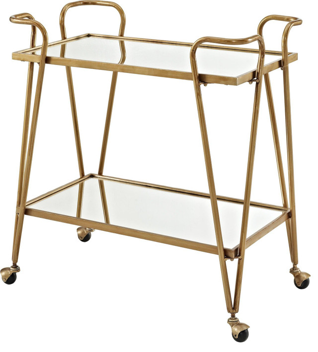 Mid Century design meets versatile utility and storage with the Linon Victory Gold Mid-Century Bar Cart. The spacious mirrored top and bottom shelf provide ample room for bottles, glasses and other bar necessities. Durable castors make for easy mobility around your space. Finished in gold, the piece is stylish and unique. Measures 30''W x 17.38''D x 31.75''H.