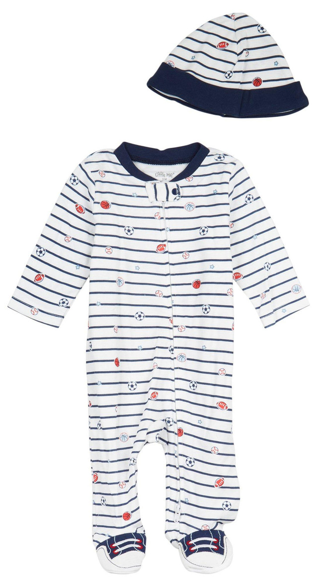 Introducing the Baby Boys 2 piece Sports Star Footed Sleeper Set, a charming bedtime outfit for your little one. This set includes a sports ball print footed sleeper with full front zip closure and matching hat. Made from soft and durable cotton, this set ensures comfort and easy care.