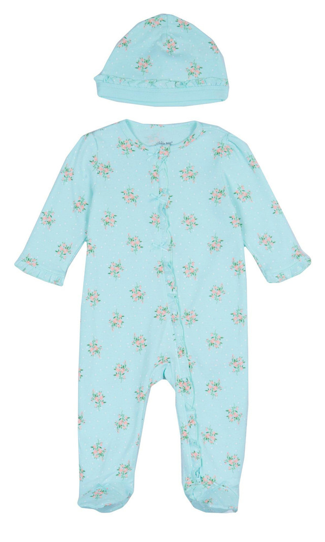 This footed sleeper from Little Me is a cute and cozy piece for your baby girl! It features a stylish floral print, a full front snap button closure, and a matching hat. Fabrication is 100% cotton.