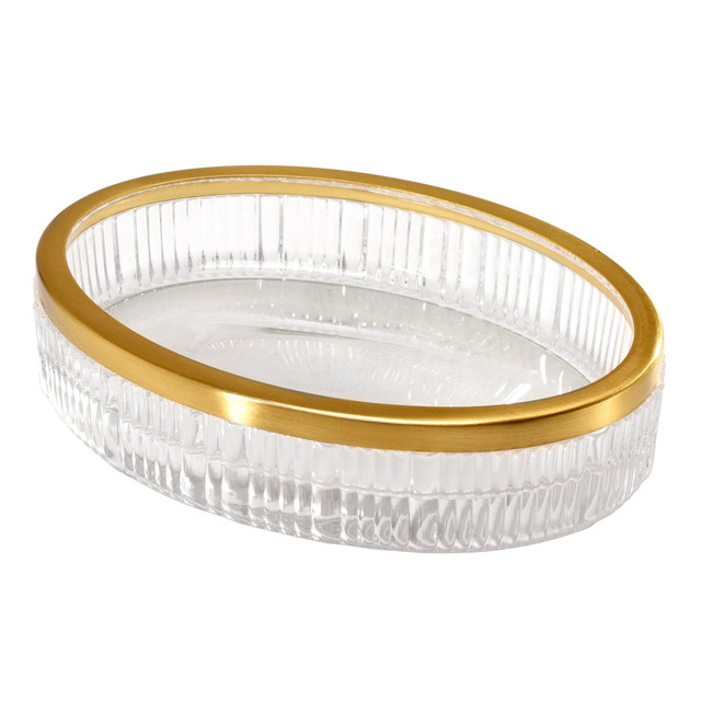 The Nicole Miller Louise Bathroom Collection Soap Dish features a clear fluted design with a brushed gold rim decorating the top. A great addition to any trendy bathroom or kitchen-works with almost any décor. Shop the entire Louise Bathroom Collection.Dimensions:5.12 x 3.70 x 1.22
