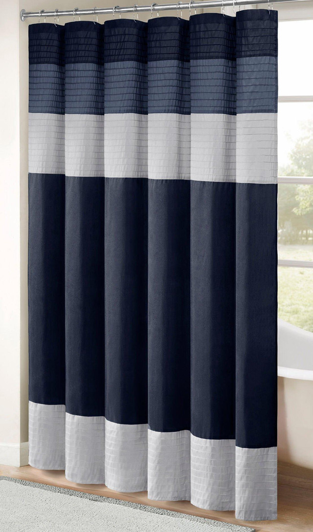 This Madison Park Amherst Shower Curtain features piecing and pintucking details to create a faux dupioni fabric that is easy to care for. 100% polyester. Measures 72''L x 72''W.