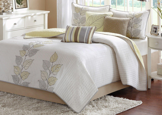 Madison Park Caelie Set features a classic stylish look with an embroidered leaf print as well as subtle stripes that add texture. Reverses to solid yellow. Set includes coverlet, 2 pillow shams, and 3 decorative pillows. Pillows measure 16'' x 16'', 18'' x 18'', and 12'' x 18''.