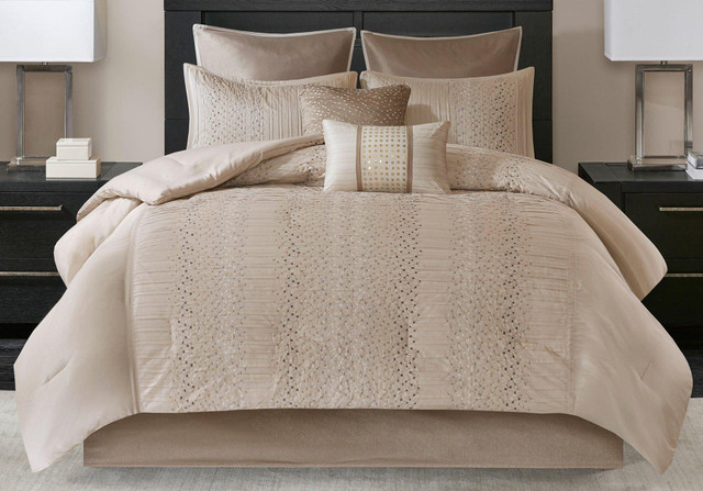 In the Madison Park Camelia Comforter Set, the faux silk pieced comforter and shams flaunt a geometric embroidery design that adds charm and texture to the top of the bed. Two polyoni Euro shams provide a rich color to the bedding set, while a coordinating bed skirt offers a clean and crisp finish. Set includes comforter, 2 pillow shams, 2 euro shams, 1 bed skirt (15'' drop), and 3 decorative pillows. Pillows measure 18'' x 18'' and 12'' x 18''.