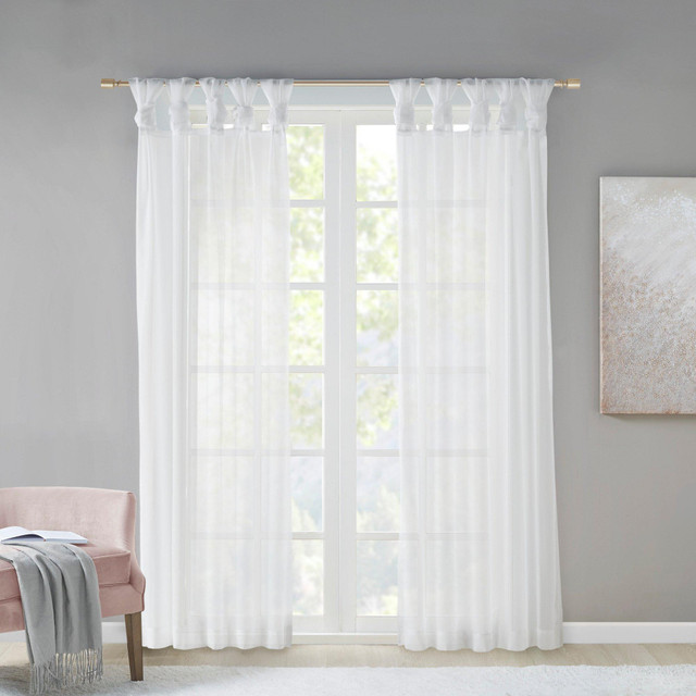 Soften your space with the Madison Park Ceres Twisted Tab Voile Sheer Window Pair. This soft panel pair provides a simple and airy update to your decor, with its lightweight voile sheer base and delicate color palette for the perfect ethereal touch. The DIY twist tab top creates beautiful and delicate folds for a stylish decorator's touch. Machine washable and easy to hang, open, and close throughout the day and fits up to a 1.25 diameter rod.