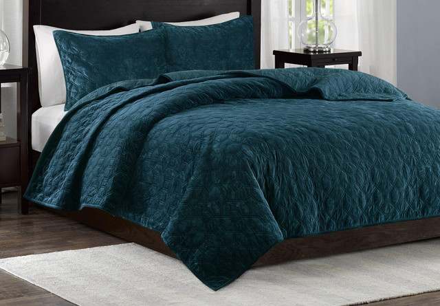 The Madison Park Harper Faux Velvet Reversible 3 Piece Coverlet Set is perfect for those seeking a casual and comfortable update to their bedroom. The rich teal color and the geometric stitch pattern, however, makes the coverlet charming enough to stand alone on your top of bed as an alternative to your comforter. Set includes coverlet and two shams.