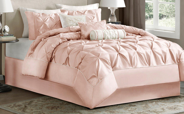 The Madison Park Laurel Comforter Set is made from 100% polyester polyoni and has pieced fabric sewn together to give this set dimension. It is finished with a smooth edge of fabric that creates a beautiful border around this comforter. Set includes one comforter, two pillow shams, one bed skirt with a 15'' drop, and three decorative pillows. Pillows measure 18''L x 6.5''W, 18''L x 18''W, and 12''L x 18''W.