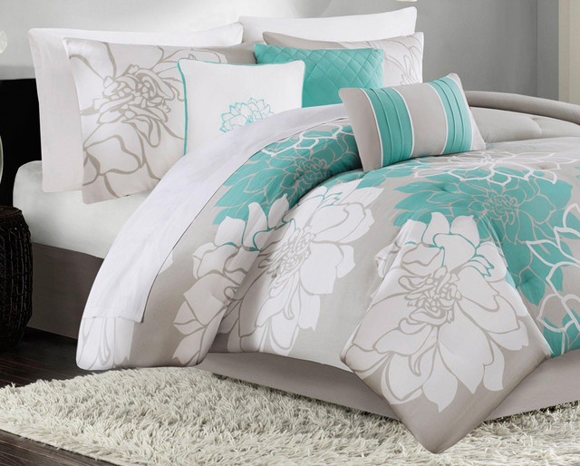 The Madison Park Lola 7-pc. Comforter Set features a floral print in soft grey and aqua blue. Set includes comforter, bed skirt (15 in. drop), 2 pillow shams, & 3 decorative pillows. Pillows measure: 16 in. x 16 in. & 12 in. x 20 in. & 18 in. x 18 in.
