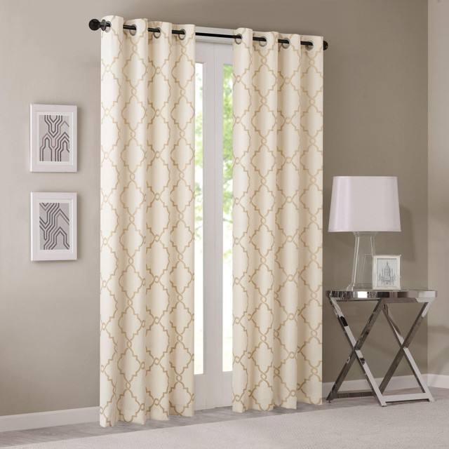 Add a casual update to your home with the Madison Park window curtain. This window panel features a scroll geometric fretwork print design window curtain panel in grommet top, silver grommet top finish, and is an opaque curtain that offers privacy. Curtain features print detailing on cotton blend basketweave fabric. Fits up to a 1.25 diameter rod. Measures 50''W. Panels sold individually.