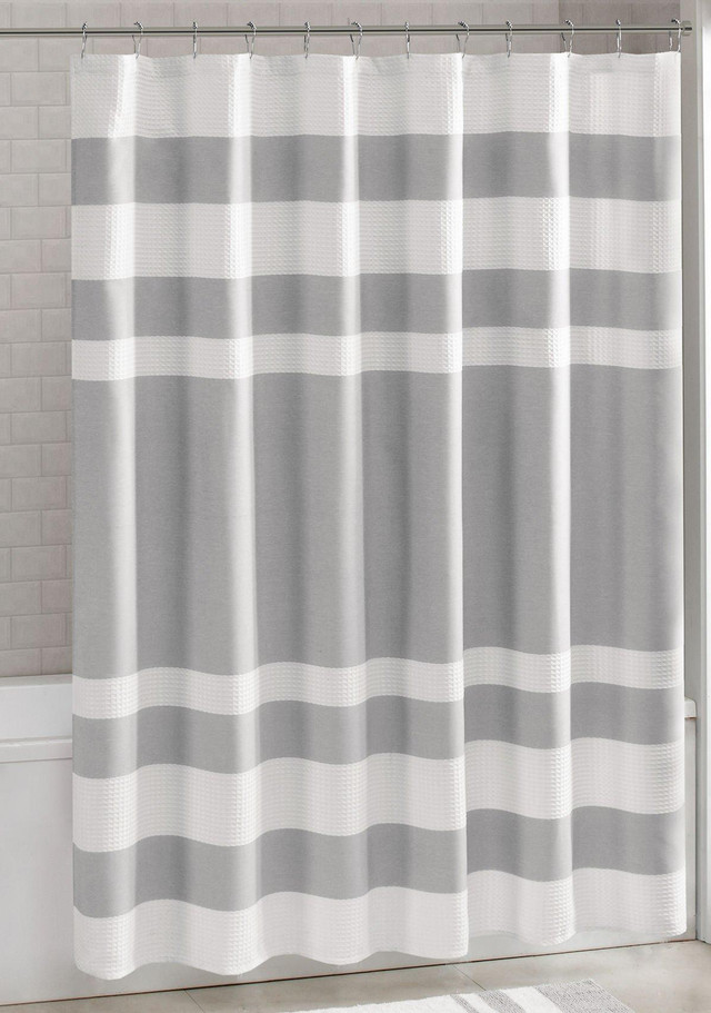 This 72 x 72 inch Madison Park Spa Waffle Shower Curtain features 3M water repellent scotch-guard treatment with large color blocking design. 100% polyester.