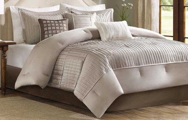 Madison Park Trinity Set features beautiful taupe polyester charmeuse with pleating details. Set includes comforter, 2 pillow shams, 1 bed skirt (15'' drop), and 3 decorative pillows. Pillows measure 16'' x 16'', 18'' x 18'', and 12'' x 18''.