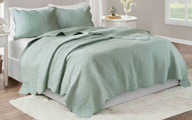 Madison Park Tuscany Scalloped Edge Coverlet Set is the perfect coverlet to use as a layering piece or an alternative to your comforter for a new solid look. The decorative stitch pattern pairs easily with your existing décor. This coverlet is filled with cotton filling and features a polyester microfiber fabrication on the face and the reverse. Set includes bedspread and 2 shams.
