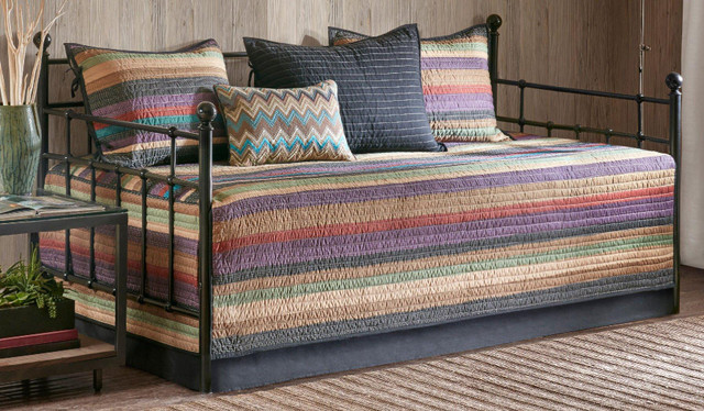 For an updated look, the Yosemite daybed set can bring a brand new esthetic to your guest room. The quilted collection features shades of purple, teal, and earth tones in thin striping to create a beautiful look. Set includes daybed cover, 3 pillow shams, 1 bed skirt with 15'' drop, and 1 decorative pillow. Day bed cover measures 39'' x 75''.