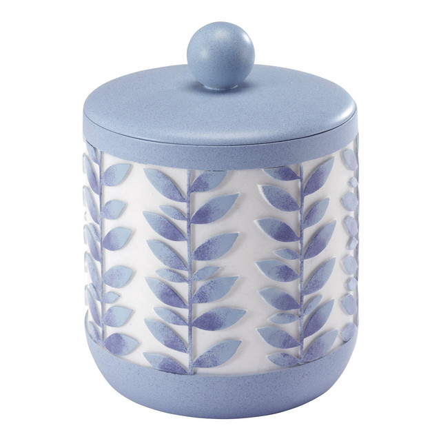 The Avanti Monterey Blue Jar features a raised leaf and vine design in periwinkle blue with purple highlights and a periwinkle top border and base. Made of durable, hand-painted resin for easy care and long life. Shop the entire Monterey Bath Collection.Dimensions: 4.13 x 4.13 x 5.51.