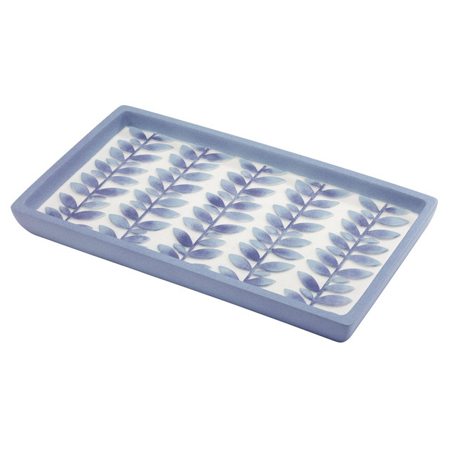 The Avanti Monterey Blue Vanity Tray features a raised leaf and vine design in periwinkle blue with purple highlights and a periwinkle top border and base. Made of durable, hand-painted resin for easy care and long life. Shop the entire Monterey Bath Collection.Dimensions: 10.24 x 5.51 x 1.06.