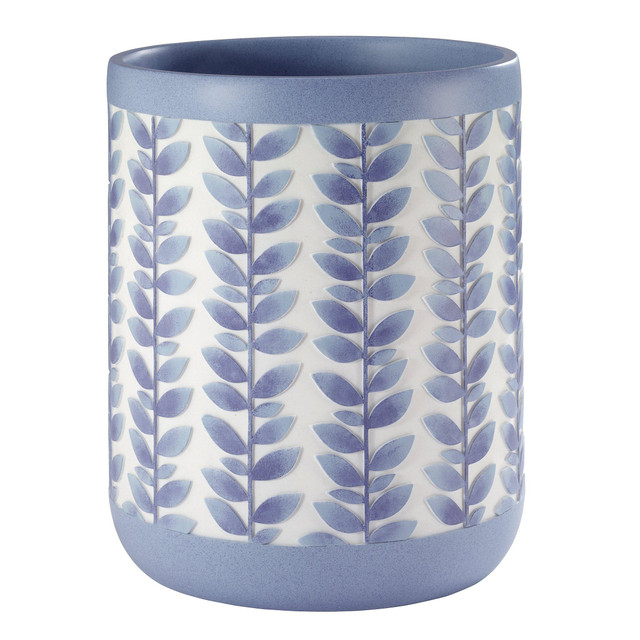 The Avanti Monterey Blue Wastebasket / Trash Can features a raised leaf and vine design in periwinkle blue with purple highlights and a periwinkle top border and base. Made of durable, hand-painted resin for easy care and long life. Shop the entire Monterey Bath Collection.Dimensions: 8.07 x 8.07 x 9.84