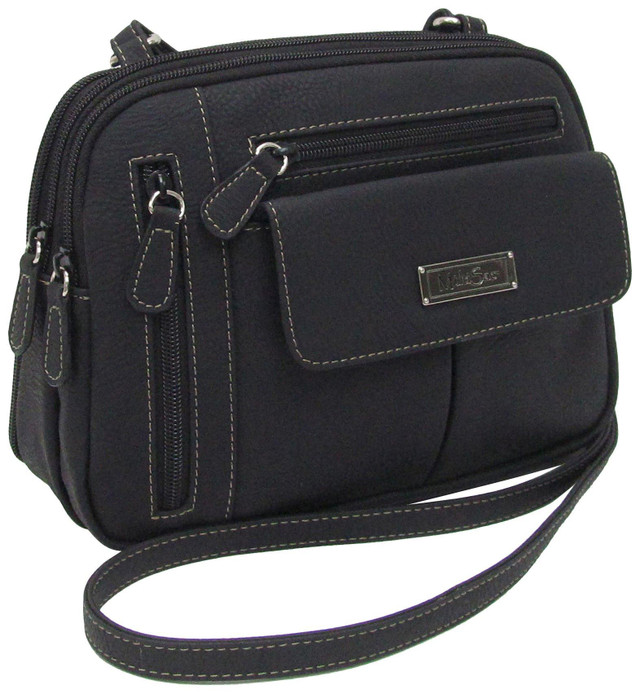 The Zippy crossbody handbag features an adjustable crossbody strap, a front flap pocket, two zipper pockets, one rear slip pocket, two main zip compartments, and one zip-around compartment. The rear compartment contains one zipper divider pocket, and six credit card slots. Measures approximately 9.5 in. L x 3 in. W x 7 in.H.