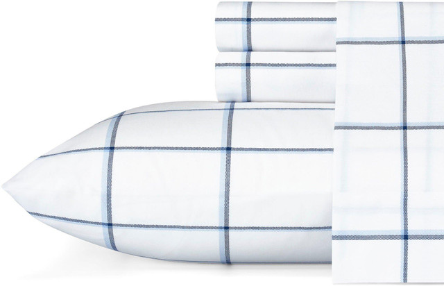 Add a touch of excitement to your bedding ensemble with the Nautica Plot Sheet Set. Sheets and coordinating pillowcases utilize the classic Nautica windowpane cotton percale sheeting layers in a tonal navy and chambray palette grounded with bright white. Includes fitted sheet, flat sheet, and two pillowcases (one pillowcase for twin).