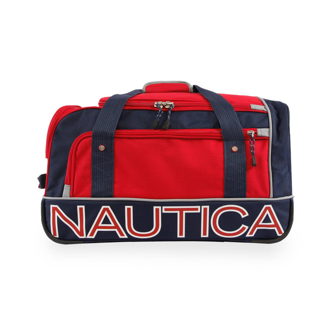 The Nautica duffel has the perfect multi-functional design, use it as a sports bag, gym bag or weekend trip bag. Just a duffel that's just the way you want it, there are no weird pockets or complicated compartments to limit you. Features large exterior zippered pockets, adjustable/removable shoulder strap and fully lined interior. You can pack as much as you want and in any way to fit your needs. Measures 22 in. x 12 in. x 12 in.