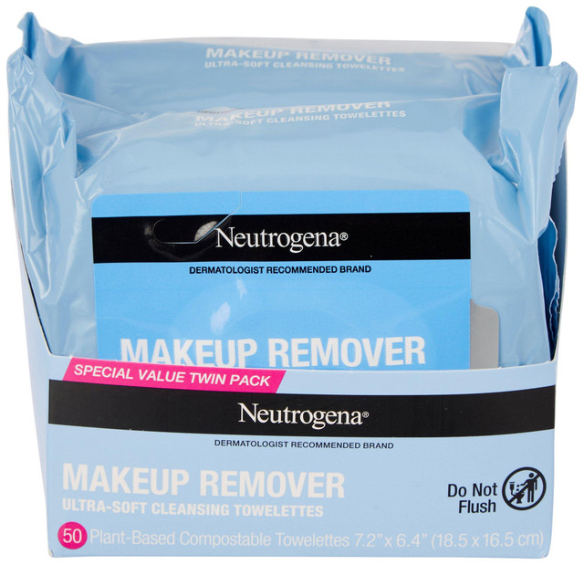 These Neutrogena 25-Pk. Makeup Remover Ultra-Soft Cleansing Towelettes contain a triple emollient blend to condition, leaving skin refreshingly clean with no heavy residue. Removes up to 99% of dirt, oil, sunscreen, and waterproof makeup. Scented. Contains 2 x 25 7.2 x 6.4 pre-moistened plant-based compostable towelettes.