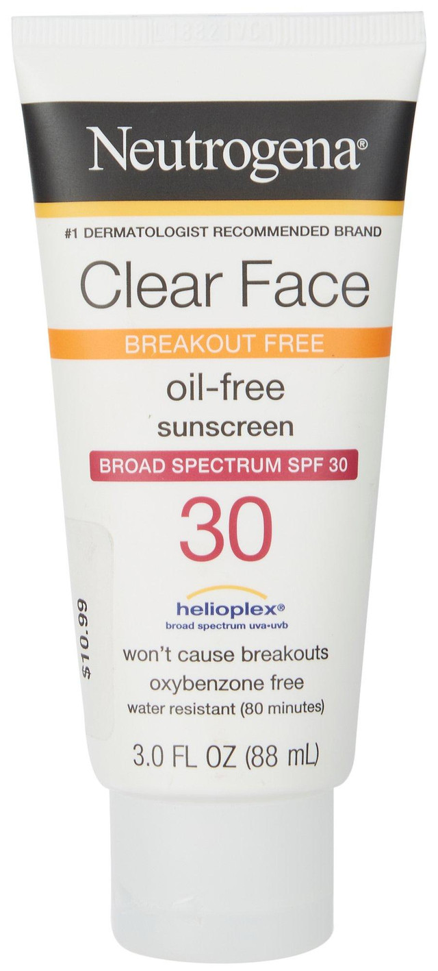 This Clear Face oil-free, fragrance-free sunscreen from Neutrogena features an oxybenzone-free formula that helps prevent breakouts. SPF 30 broad spectrum. 3 fl. oz.