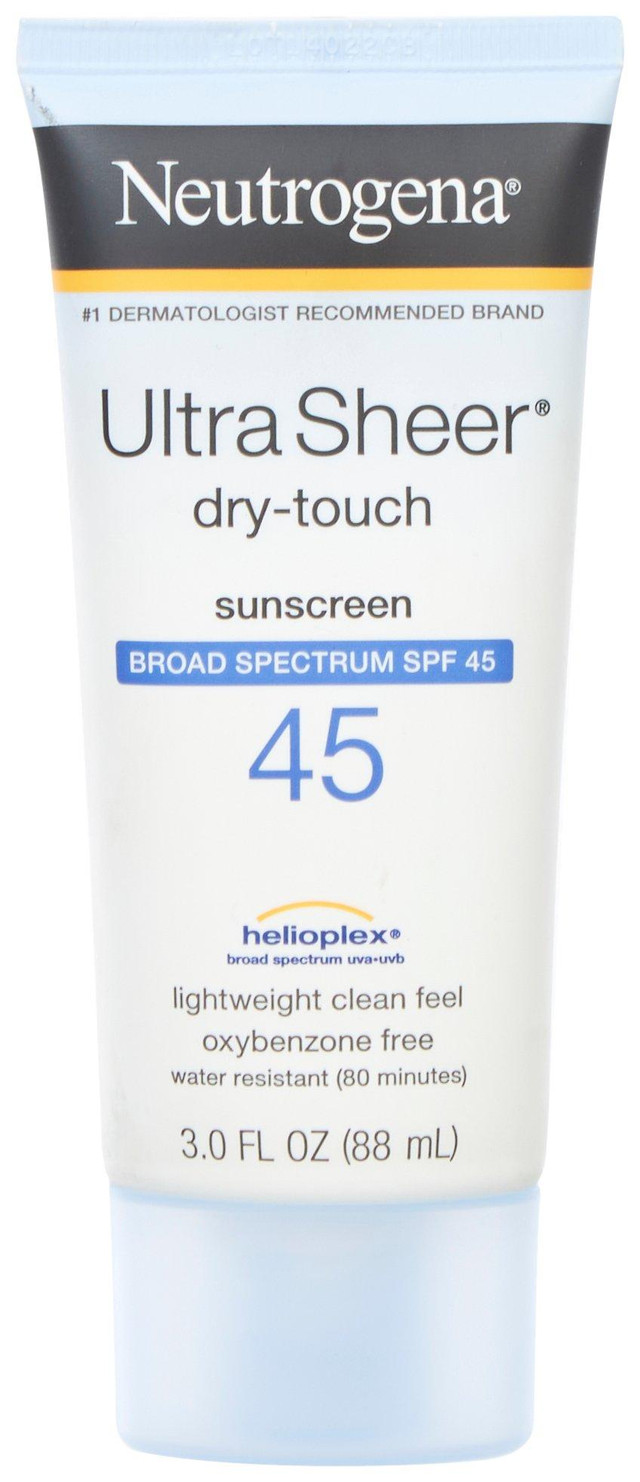 This Ultra Sheer Sunscreen from Neutrogena features a lightweight clean feel & oxybenzone-free formula. SPF 45 broad spectrum protection. Bottle contains 3 fl oz.