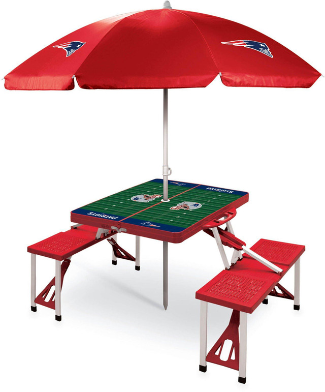 Picnic Time's portable Picnic Table has legs and seats that fold into the table when collapsed and has a maximum weight capacity of 250 lbs. per seat and 20 lbs. for the table. Includes a standard sized beach umbrella. Measures 34'' x 4.25'' x 66'' and weighs 20lbs.