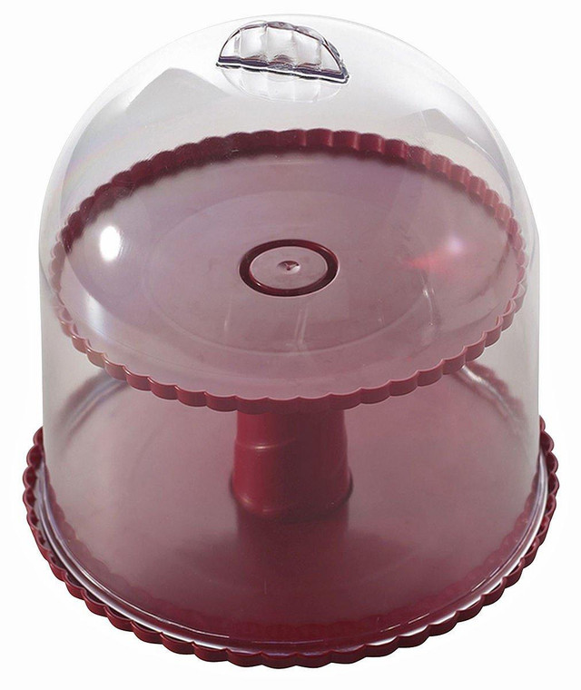 Nordic Ware 2-Tiered Dessert Stand with Dome Lid is a dome-covered 2-tier pedestal to display, store & transport desserts with no hassle. Holds 12 cupcakes or dozens of cookies. This set is BPA & melamine-free. 10''L x 10''W x 10.75''H.