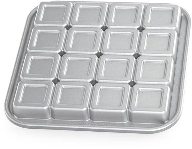 To make crispy on the outside and fudgy on the inside fill the indent with caramel or other fillings. This brownie bites pan from Nordic Ware makes 16 individual servings. Made of cast aluminum and a PFOA-free nonstick coating and measures 9.68'' x 9.68 '' x 0.875''.