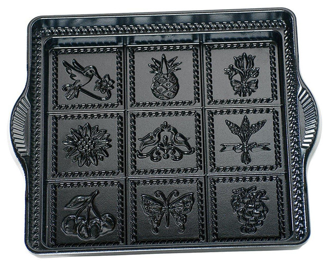 Nine flower and fruit designs are created when you bake with this Nordic Ware English Shortbread Pan. This cast aluminum pan is oven safe to 400 degrees & features a PFOA-free nonstick interior. 8.88''L x 8.88''W x 1.13''H.