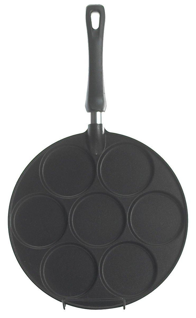 Nordic Ware Silver Dollar Pancake Pan with PFOA-free nonstick interior makes silver dollar-sized pancakes. Griddle has seven 3'' cavities. For use on gas, ceramic & electric stovetops. 17.5''L x 10.5''W x 2.25''H