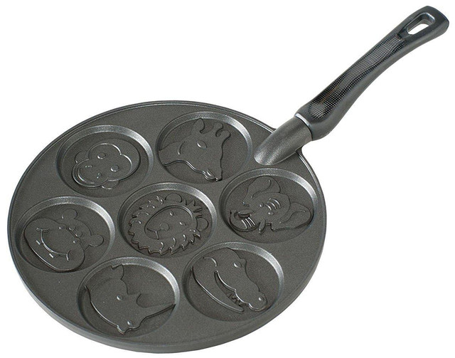 Nordic Ware Zoo Friends Pancake Pan with PFOA-free nonstick interior makes fun animal creature pancakes like a giraffe, monkey, lion, elephant, hipp, rhinoceros or alligator. Griddle has seven 3'' cavities. For use on gas, ceramic & electric stovetops. 17.5''L x 10.5''W x 2.25''H