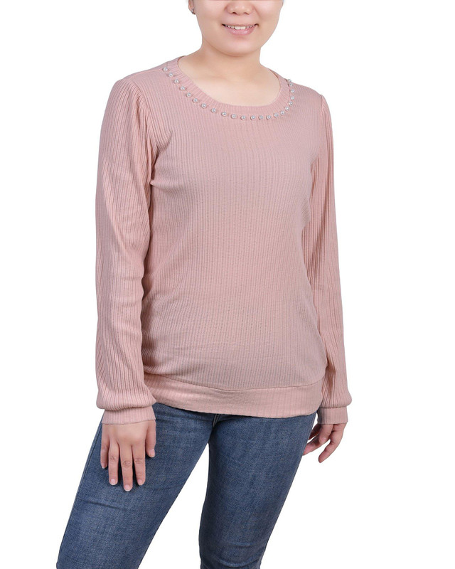 NY Collection Petite Long Sleeve Knit Crepe Rhinestone Top