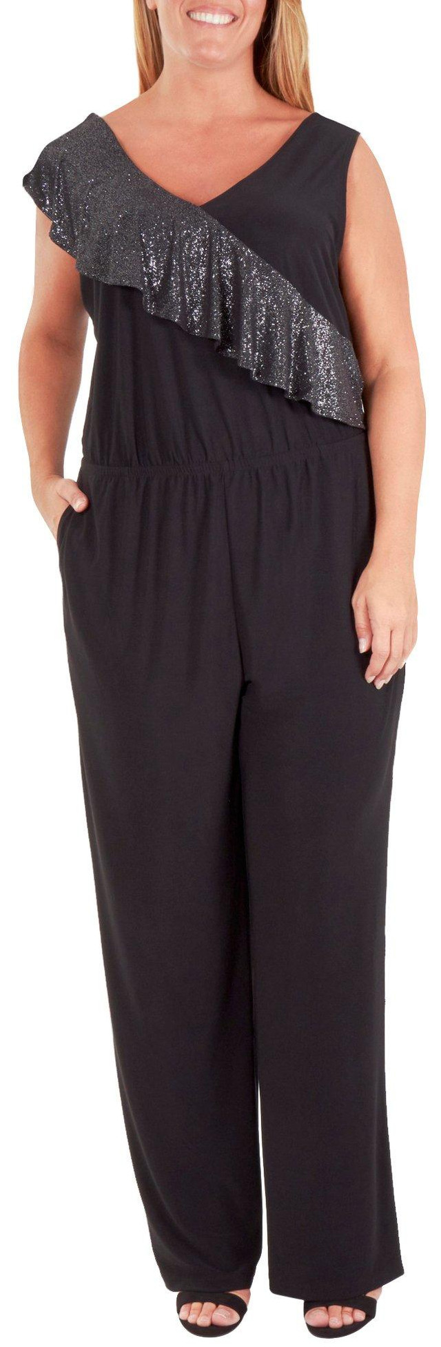 NY Collection brings a comfortable and stylish look to your wardrobe. A glitter ruffle cascades down the neckline of this sleeveless jumpsuit giving your outfit a touch of glam perfect for the upcoming holiday season. Inseam length is approximately 30.5 inches from size 2X.