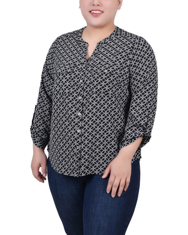 NY Collection Plus 3/4 Sleeve Roll Tab Y Neck Blouse
